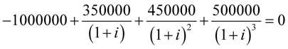 Zvažujeme investici ve výši 1 mil. Kč. Př íjmy budou plynout po dobu 3 let následujícím způsobem. 1. rok př íjem ve výši 350 000 Kč, v 2. roce př íjem 450 000 Kč a ve 3. roce 500 000 Kč. Úroková sazba porovnatelné investice je 12 % p. a. (tj. roční úroková sazba). Jak se rozhodnete podle kritéria vnit ř ní výnosové míry?