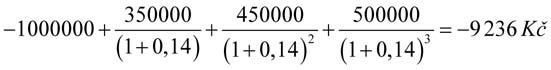 Ve vzorci je uveden i mezivýpočet současných hodnot budoucích př íjmů v jednotlivých letech, kde je mimo jiné vidět, že př íjem 500 000 Kč za 3 roky představuje menší současnou hodnotu než př íjem 450 000 Kč za 2 roky př i uvažované roční úrokové sazbě 12 %. Částka 1 000 000 Kč je se záporným znaménkem, protože se jedná o výdaj a zároveň není diskontována, protože je investována nyní, v čase 0. Částka 350 000 Kč je diskontována diskontním faktorem 1/1,12, protože tento př íjem nastane právě za 1 rok, částka 450 000 je diskontována diskontním faktorem 1/1,122, protože tento př íjem nastane právě za 2 roky atd.