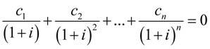 Platí stejné proměnné jako u předchozí metody, stejně tak to, že př íjmy značíme kladným znaménkem a výdaje záporným znaménkem. Oproti předchozí metodě současné hodnoty je v tomto př ípadě neznámou veličina i, kterou dopočítáváme tak, aby se levá strana rovnice rovnala nule.
