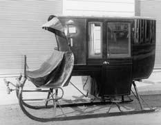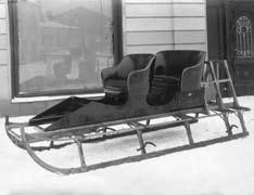 Sportovní bobové saně. Na vzpěrách pod sedadly jsou patrné ostruhy pro rejdování a brzdění, vzadu nosič zavazadel, pod druhou řadou sedadel uzamykatelná schránka