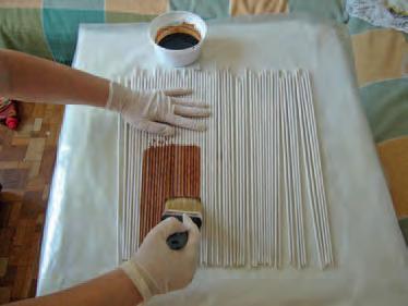Ruličky můžeme namořit buď ještě před pletením, nebo až po dokončení koše. V prvním případě si připravíme igelit, mořidla, štětec a kartón, případně starý plech na sušení ruliček. Nejrychleji uschnou ruličky natřené mořidlem.