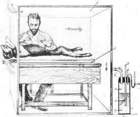 Pro rozvoj hrudní chirurgie byla zásadní otázka anestezie a ventilace pacienta během operace. V roce 1904 přišel Johann von Mikulicz s myšlenkou, jak vyřešit problém s otevřeným pneumotoraxem během resekce jícnu, o kterou se do té doby neúspěšně pokoušel 4. Jeho ideu podtlakové komory rozpracoval Ferdinand Sauerbruch. V jeho známé „komoře s podtlakem“ udržovaným kolem -7 do -8 mm Hg, se nacházel operační tým i pacient (obr. 1.1). Pacientova hlava se nacházela mimo komoru. Tak mohl pacient dýchat vzduch z atmosféry a plíce byla rozepnuta díky podtlaku v komoře. Na opačném principu představil v roce 1907 Brauer