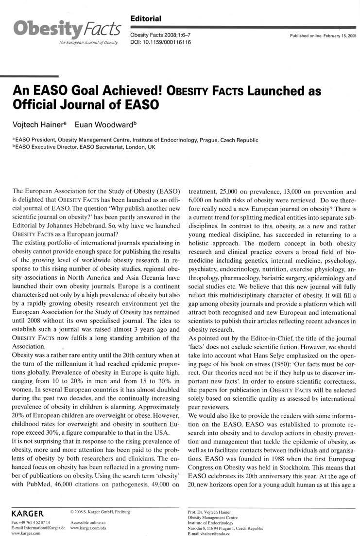 HAINER V, WOODWARD E. An EASO goal achieved! Obesity Facts launched as official journal of EASO. Obes Facts 2008; 1: 6–7.