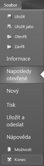 Rychlý přístup. Úplně nahoře, v levém horním rohu, se nachází panel nástrojů Rychlý přístup (viz obrázek 1.5). Zde můžete mít umístěna tlačítka, která jste byli zvyklí používat na panelech nástrojů např. ve verzi 2003 (i v následující verzi 2007) a která vám slouží k rychlejšímu provedení té které činnosti.