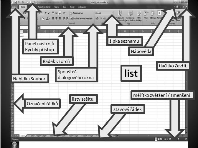 Obrázek 1.3: Microsoft Excel 2010 a hlavní prvky okna programu