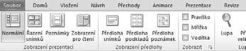 Zpracovávanou prezentaci můžete zobrazit několika různými způsoby, každý způsob zobrazení je určen pro jiný typ činnosti. Jednotlivé způsoby zobrazení nastavíte pomocí tlačítek na kartě Zobrazení, která jsou umístěna ve skupině Zobrazení prezentací