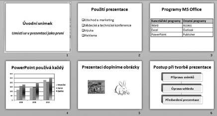 Toto zobrazení nastavíte tlačítkem Řazení snímků. Celá plocha okna s programem je vyplněna miniaturami snímků. Zobrazení Řazení snímků je určeno pro kopírování, přesun a odstraňování snímků. Obsah jednotlivých snímků se v tomto zobrazení nedá upravovat. Normální zobrazení nastavíte tlačítkem Normální nebo poklepáním na některý ze snímků; tento snímek se pak nastaví jako aktuální.