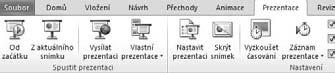 Místo tohoto zobrazení je však lepší spustit předvádění prezentace, protože snímky zaberou celou plochu monitoru a získáte tak lepší představu, jak bude prezentace na plátně vypadat. Spuštění prezentace provedete na kartě Prezentace pomocí tlačítek Od začátku (spuštění prezentace od prvého snímku) nebo Z aktuálního snímku (spuštění prezentace se snímkem, nastaveným v normálním zobrazení). Spuštění prezentace od začátku můžete také provést pomocí klávesy F5 Pro pohyb mezi snímky použijete opět klávesové šipky dolů a nahoru nebo klávesy PAGEDOWN a PAGEUP, návrat do normálního zobrazení provedete klávesou ESC.