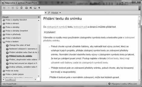 Nápovědu programu PowerPoint 2010 spustíte klávesou F1. Nápověda se zobrazí v samostatném okně, které má na hlavním panelu také svoje tlačítko.