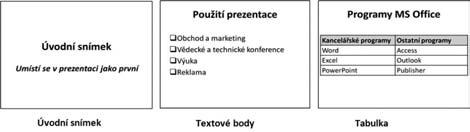 ❚ Vytvořit novou prezentace na základě některé ze standardních šablon. Prezentace vytvořená na základě standardní šablony obsahuje již vytvořené snímky, které můžete podle potřeby upravit a doplnit.