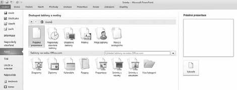 Pro vytvoření nové prezentace ze standardní šablony použijte opět kartu Soubor, příkaz Nový a klepněte na tlačítko Ukázkové šablony. Zvolenou šablonu označíte klepnutím (vpravo je zobrazena ukázka) a klepnete na tlačítko Vytvořit