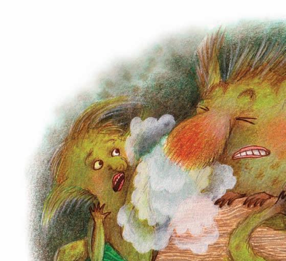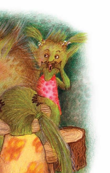 hejkalátka k obědu. Maminka Hejkalová usmažila smrkové šišky a přelila je kapradinovou omáčkou.