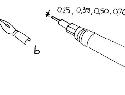 Obr. 1 Pomůcky pro perokresbu a – redis pero, b – školní pero, c – technické tušové pero