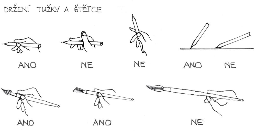 správná poloha těla, papíru, držení tužky, pera a štětce úprava výkresů