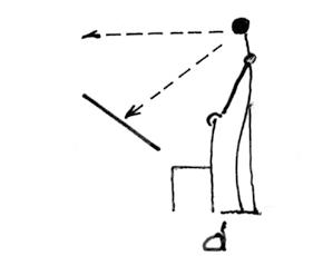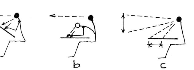 Obr. 2 Držení těla při kresbě a – správné držení těla, správný sklon čtvrtky b – špatný sklon čtvrtky, při shýbání ztratíme souvislost skutečnosti a kresby c – jako b, zkreslené vyobrazení d – kontrola zobrazení v odstupu – lepší zjištění chyb