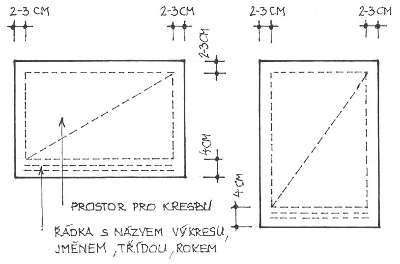3 cm široký, u dolního okraje o něco větší, aby se do něj dala umístit jednoduchá řádka se jménem, třídou, rokem, případně i s názvem výkresu. Nedoporučuji používat rozpisky remních typů.