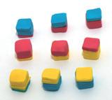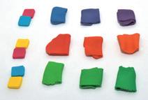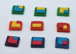 Postup při míchání primárních barev: Potřebujete k tomu dvě vykrajovátka různě veliká (zde ve tvaru čtverce) a kousky hmot v primárních barvách (u Fimo je to magenta, tyrkys a žlutá; u jiných značek se může jednat například od barvu fuchsia – růžová, či cyan – modrá).