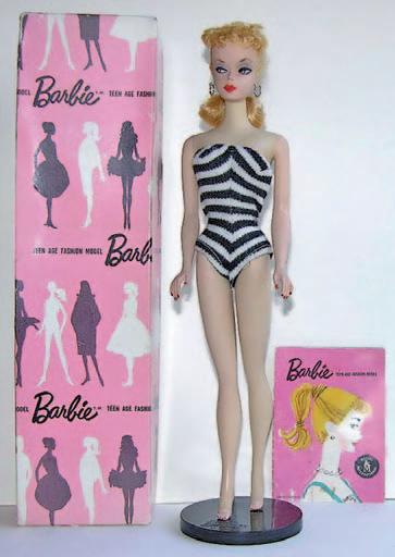 Marilyn Monroe nebo Elizabeth Taylor. Typické nasazení vysoce klenutého obočí, vyšpulené červené rtíky, upejpavý boční pohled, štíhlé tělo v barvě slonové kosti, úzký pas, boky a dlouhé nohy. To vše se odrazilo na první panence Barbie, která byla jen 11,5 palce (cca 29 cm) vysoká, štíhlá blondýnka s vyvinutými ňadry na vysokých podpatcích, oficiálně nazvaná „Teenage Barbie Fashion Model“. Ruth Handlerová jí dala jméno Barbie podle své dcery Barbary. Oblečena byla do bíločerných pruhovaných plavek s vlasy staženými do ohonu. Poprvé byla veřejnosti představena 9. března 1959 na Mezinárodním veletrhu hraček v New Yorku.