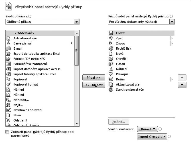 Obrázek 2.4: Panel Rychlý přístup lze snadno přizpůsobit
