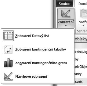 Seznam karet, z nichž můžete vybírat, se dynamicky mění podle toho, co právě děláte. Je tedy jiný, když zadáváte data do tabulky a jiný třeba když upravujete dotaz v návrhovém zobrazení. Tím je zajištěno, že v danou chvíli máte k dispozici všechny potřebné příkazy, ale nikdy žádné zbytečné. Ovládání programu je tak přehlednější.