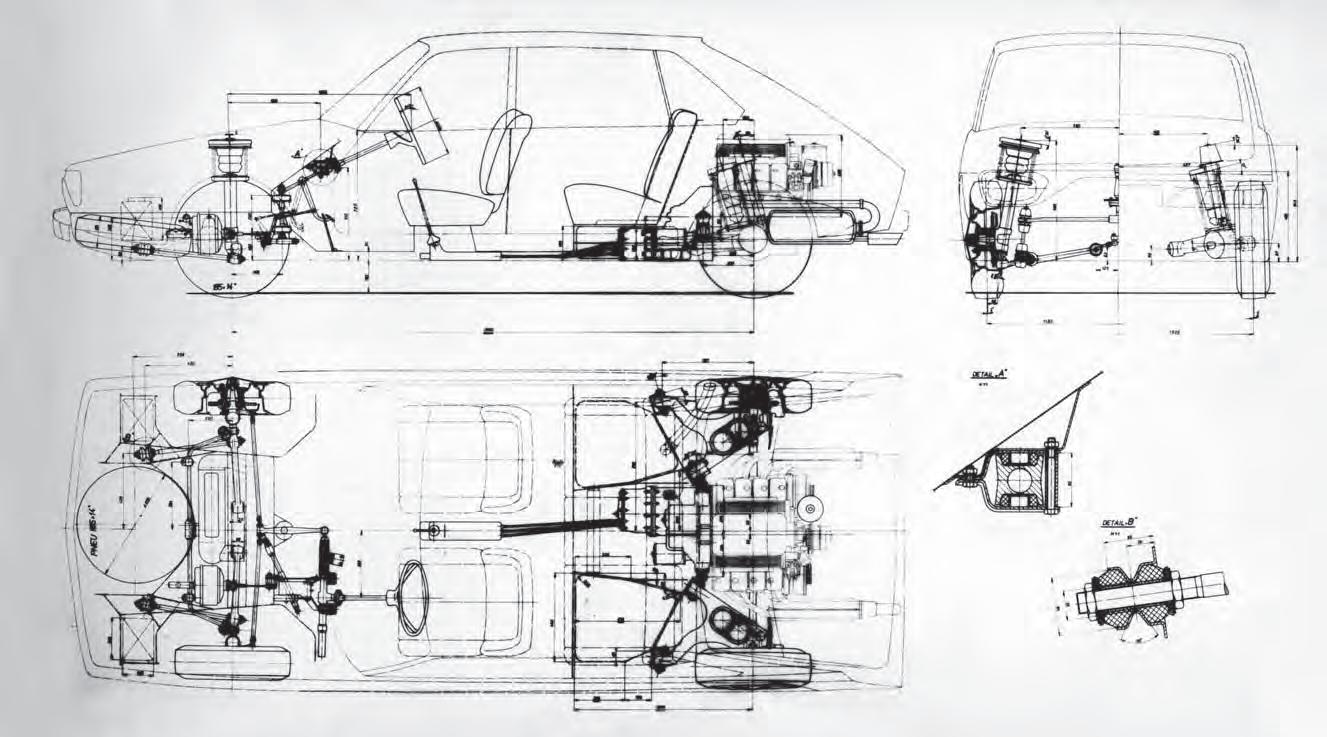 uprostřed její délky, nýbrž mezi prvním a druhým párem válců. Vpředu bylo zavěšení McPherson, vzadu trojúhelníková vlečená ramena se šikmou osou kývání. Vůz měl mít rozvor 2900 mm, předpokládanou délku 4800 mm, šířku 1800 mm a výšku 1420 mm. Vzhledem k reprezentačnímu charakteru rodícího se automobilu byl poté rozvor prodloužen o 80 mm na 2980 mm. Kvůli lepšímu rozložení hmotnosti na přední a zadní kola byl motor mírně posunut kupředu, nad zadní nápravu, takže osa hnacích hřídelů procházela mezi druhým a třetím párem válců. I nadále byl zakreslen osmiválec T 603 s rozvodem OHV, dvěma ventilátory a objemem 2,5 l, v tomto případě už v provedení T 603 K s již zmíněnou pozicí rozvodovky v polovině délky klikové skříně. Výkres z konce října