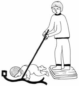 Zasažení proudem nízkého napětí (do 1000 V): nejjednodušší a nejbezpečnější je přerušení přívodu proudu – vypnout jistič, vytáhnout zdroj ze zásuvky; jinou variantou je odstranění vodiče z přímého kontaktu s postiženým – suchým, nevodivým předmětem (obr. 1).