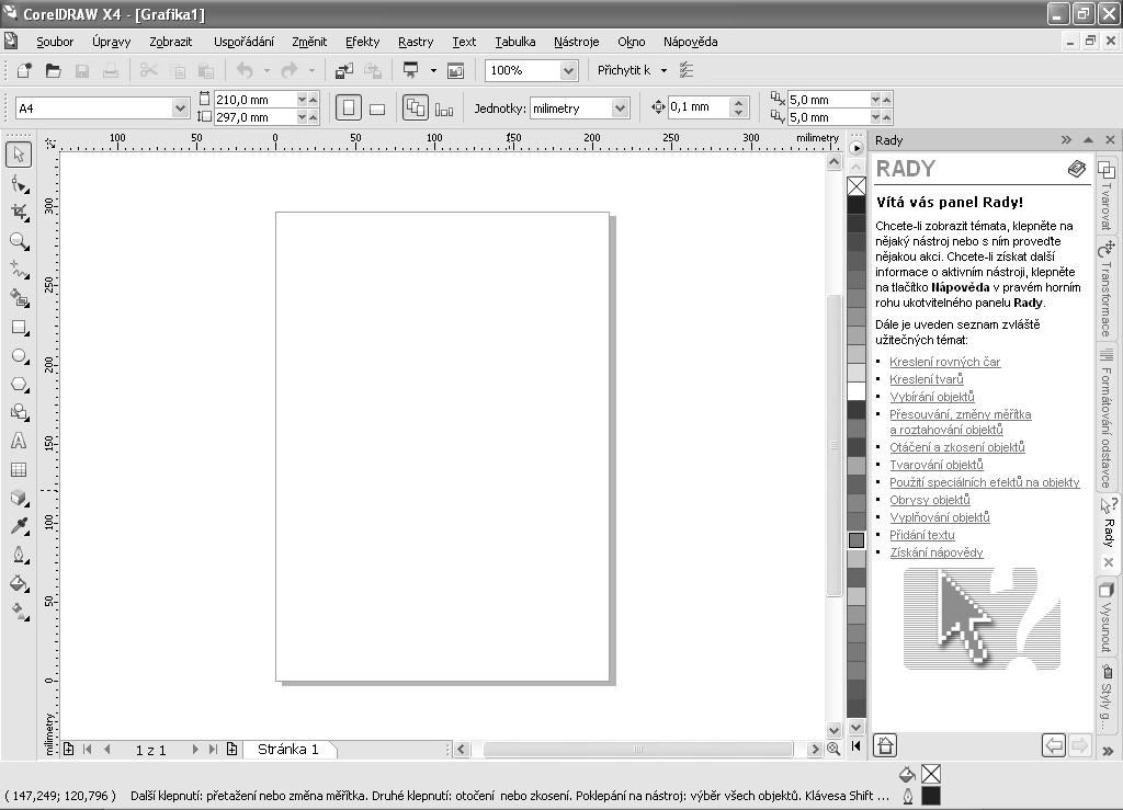 Obrázek 1.1: Pracovní prostředí programu CorelDRAW s nově vytvořeným dokumentem