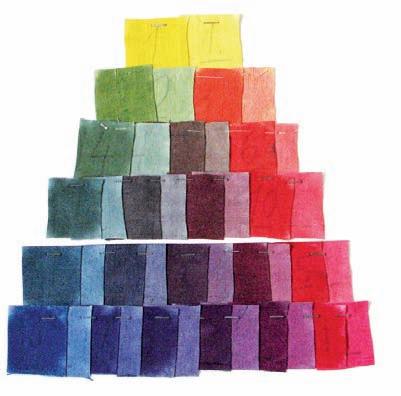 Ukázka tříosého mísení tří purů na lněném plátně. Každý odstín je ve vzorníku v dvojici: jednou neředěný (daný maximální rozpustností barviva) a podruhé v ředění 1:3 s vodou