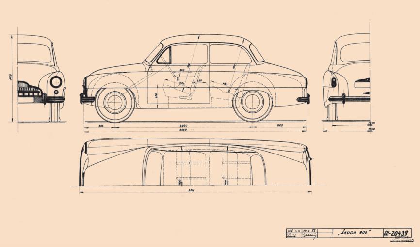 Výkres malého vozu Škoda 900 s rozvorem náprav 2200 mm (1953)