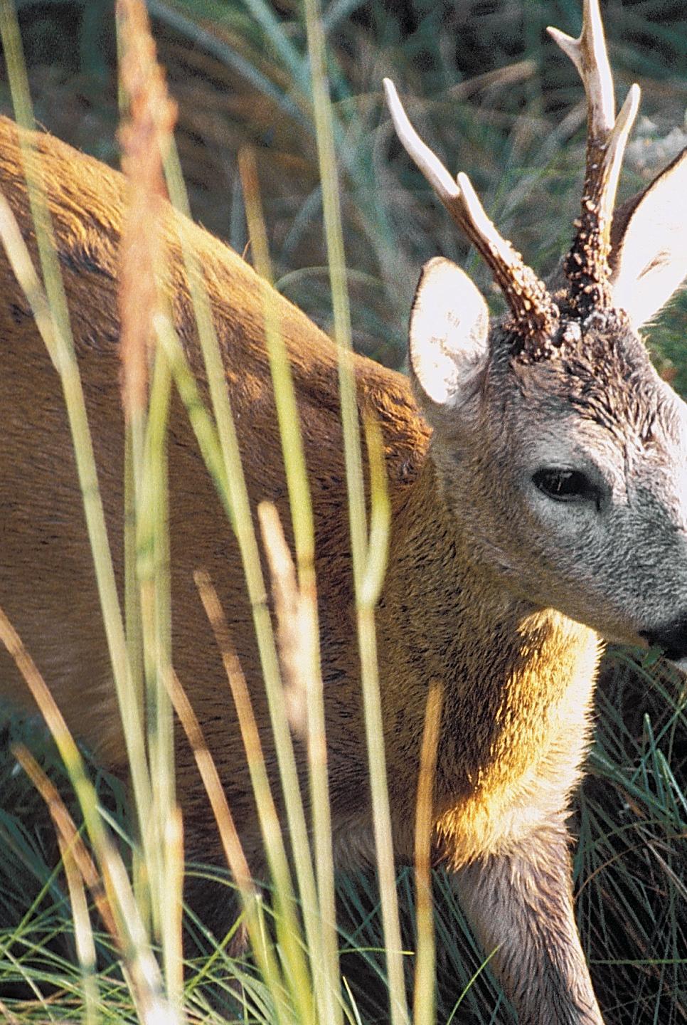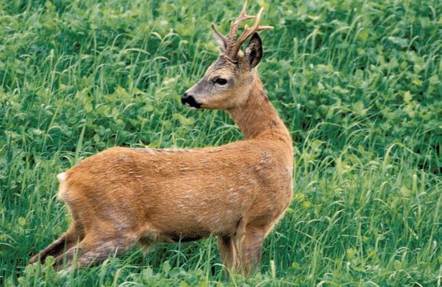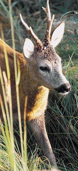 Obr. 7 (foto Miloslav Kratochvíl) –Srnec v1. vûkové tfiídû (‰tíhl˘ profil tûla, zdánlivû vysoké bûhy, dosud ‰tíhl˘ krk) na konci jarního pfiebarvování.