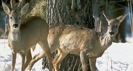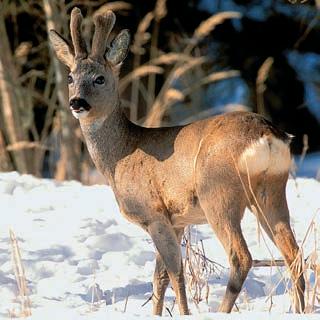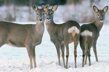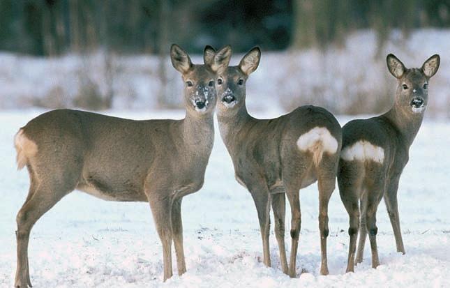 Obr. 5 (foto Miloslav Kratochvíl) – Rodinka srnãí zvûfie vzimní srsti. Vlevo srna (dobfie patrná zástûrka – srovnejte sobr. 16), uprostfied srneãka azcela vpravo srneãek (chybûjící zástûrka, v˘razné puãnice, pravdûpodobnû isprvotními paliãkami). Srna asrneãka jsou stejného vzrÛstu, pro odli‰ení by mûla poslouÏit vizáÏ obliãeje (protaÏenûj‰í obliãejová partie star‰í srny azejména stejn˘ v˘raz obou mlad˘ch kusÛ sv˘razn˘mi svûtly). Na snímku je rovnûÏ vidût rozdíl vtvaru obfiitku uobou pohlaví.