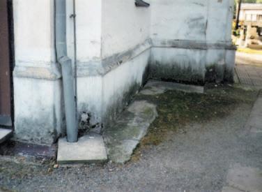 Obrázek 2.5 Nadměrné zavlhčení soklu následkem odstřikující vody a použití nevhodného fasádního nátěru v místě soklu. Chybné napojení dešťového odpadu