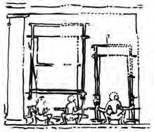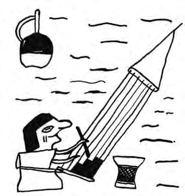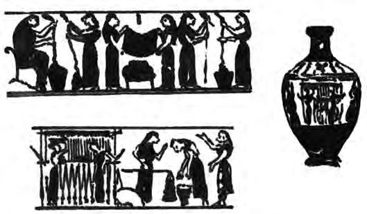 životě dochovalo na vázách. Naše kresbička vázy popisuje celý postup tkaní od předení, barvení až po hotovou tkaninu. Tká se na stavu shora dolů a osnovní nitě jsou zavěšeny na kamenech. Tyto kresby jsou však již z doby 570 let př. n. l. Tkalo se vlnou, a i když zmínka o pěstování ovcí pochází z roku 6200 př. n. l., o jejím spřádání se mluví až kolem roku 1000 př. n. l.