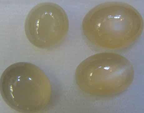 Vzhled: bílý, mléčně zbarvený někdy až průsvitný kámen se zvláštním, tzv. kolébavým leskem. Tento lesk a barva skutečně připomínají světlo