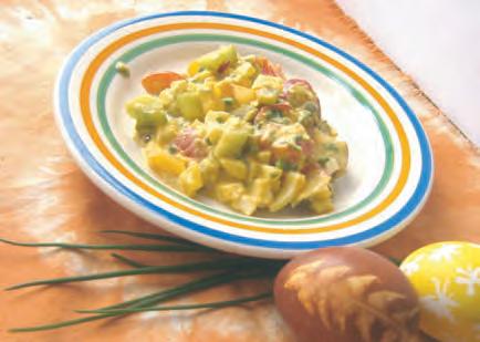 Postup: Vykoledovaná vejce oloupeme, okrájíme obarvené části bílku a vyhodíme všechna podezřelá vejce, která nevypadají čerstvě. S loupáním a krájením vajec na kostičky pomocí mřížky mohou pomáhat děti. Všechny suroviny nakrájíme nadrobno a v míse promícháme se zelenými natěmi a zálivkou. Podáváme vychlazené s pečivem jako lehkou večeři.