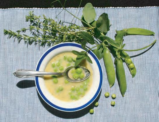 Postup: V hrnci vaříme hrách spolu se svazkem bylinek a prolisovaným česnekem a cibulí 20 minut v neosolené vodě (použijeme buď 1 hrnek hrachu zmraženého, nebo celé zelené lusky, pak musíme polévku propasírovat přes síto, nebo v zimě 2/3 hrnku suchého zeleného neloupaného hrachu namočeného den předem, nebo naklíčeného za 2–3 dny). Z bylinek si vybereme ty, které nám vyhovují. Když nemáme čerstvé po ruce, lze použít i sušené. Spolu s hrachem můžeme povařit i kousek zelené natě celeru nebo jiné natě ze zahrady. Potom vytáhneme bylinky, polévku rozmixujeme a přecedíme, abychom odstranili slupky hrachu. Zjemníme sušeným ovesným mlékem a přidáme olej či máslo a dosolíme. Do polévky přidáme čerstvý vyloupaný hrášek (nebo mražený) povařený zvlášť 10 minut v trošce vody. Malým dětem přidáváme jen jeden druh bylinky a osolíme jen mírně. Polévka je nejlepší s přidáním čerstvého hrášku a děti rády pomáhají