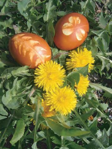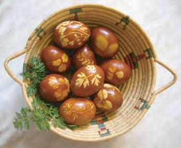 Před Velikonocemi schováváme všechny čisté slupky z cibule žluté i červené na barvení vajec. Na Velikonoční neděli si natrháme s dětmi venku první zelené lupeníčko – lístky jetelíčku, pampelišky, lístky i kvítky fialek, sedmikrásek, řebříčku a dalších. Na omytá syrová vejce připevníme lístky kouskem staré silonové punčochy a pevně zavážeme. Vejce dáme vařit na mírném ohni do hrnce se studenou vodou a cibulovými slupkami (vody dáme jen tolik, aby byla vejce ponořená – čím více slupek a méně vody, tím bude barva tmavší). Vaříme asi 15 minut a vejce ponecháme v hrnci do vychladnutí. Potom z nich odstraníme punčochy s listím (po vyprání punčochy můžeme schovat k opakovanému použití), po oschnutí vejce vyleštíme hadříkem se sádlem či olejem a schováme je v chladnu do druhého dne pro koledníky. Při „cibulovém barvení“ mohou pomáhat i nejmenší děti a koledníci dostanou nejen krásnou, ale i zdravou koledu bez umělých barviv.