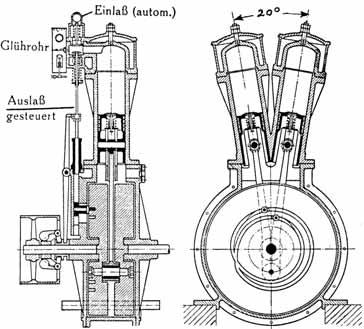 nesoucí ještě znaky parních strojů. Měl sice polokulový spalovací prostor nad pístem, ale ventily byly umístěny na boku ve výběžku, připomínajícím komůrku pozdějších naftových motorů. V jeho F-hlavě byl sací ventil nahoře a otevíral se automaticky podtlakem ve válci při sání, spodní výfukový ventil otevírala vačka na boku klikové skříně s pojistkou proti přetočení motoru. Omezovač otáček měly všechny motory už od roku 1900. Zapálení směsi obstarávala ještě žárová trubička z platiny, zasazená do spalovacího prostoru mezi ventily. Velká pozornost byla věnována chlazení sedla výfukového ventilu, jenž ještě nebyl vyroben z oceli odolné proti vysokým teplotám. Rovnoměrný chod zajišťoval, stejně jako u všech ostatních motorů, mohutný setrvačník o průměru přes půl metru.