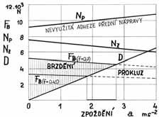 Pro tehdejší většinou jen štěrkem zpevněné a prašné vozovky byla mezní hodnota adheze nejvýše kolem 0,7, za mokra nebo na větší vrstvě sypkého materiálu klesala jen na 0,45 nebo méně. Při nízkém zpoždění stačila ještě zadní kola malou setrvačnou sílu na vozovce zachytit (vyšrafovaná plocha v diagramu na obrázku 1.22). Stejná hodnota mezní brzdné síly FB a síly setrvačné D byla hranicí, za kterou nastával prokluz kol se sníženým účinkem brzdění. Z diagramu je patrné, jak značná část adheze zůstala pro brzdění nevyužitá, když přední kola neměla možnost pohyb vozu zpomalit. Vůz s brzdami pouze na zadních kolech dosahoval zpoždění jen kolem 2 až 3 m/s2 (0,2–0,3 g) a z rychlosti 100 km/hod, které už vozy tenkrát běžně dosahovaly, zastavil tedy na dráze mezi 250 až 400 metry. Více než tunová monstra s mohutnými motory se tedy řítila na chatrných pneumatikách po prašných a nerovných cestách podle dnešních hledisek téměř bez brzd.