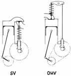 vodu s pružinami, zejména nedostatek času na vracení ventilů při přetočení motoru, potíže s vlastními kmity pružin a s jejich rezonancí, a vytloukání sedel při vysoké dosedací rychlosti ventilů. Proto vozy Peugeot (1912) a po něm i Delage (1914) na svých motorech použily desmodromický rozvod bez pružin s nuceným pohybem ventilu v obou směrech (obr. 2.19). Zůstalo ale u těchto dvou ojedinělých provedení a technologicky náročný a složitý rozvod našel další uplatnění až po dlouhých 40 letech, když tento systém použil Mercedes u svých slavných monopostů W 196 a sportovních prototypů od nich odvozených.