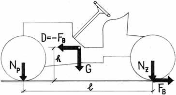 Nejslabším článkem v celkové stavbě vozů tohoto období byly nepochybně brzdy. Jejich ústrojí nebylo samo o sobě problémem, bylo už známé z ostatních oborů strojírenství jako princip brzdy čelisťové i pásové, ale u vozidel tohoto období byla brzděna jen zadní kola, a to na předlohové hřídeli řetězového pohonu nebo na kardanu a čelisťovými brzdami v zadních kolech. Podle dopravního kongresu, který se konal roku 1908 v Paříži, měla působit ruční brzda na kolech a nožní na předloze za převody nebo na kardanu. Příklad brzdění typického závodního vozu ze série závodů o cenu Gordon Bennetta, vybaveného jen zadními brzdami, je na obrázku 1.21. Celková hmotnost G (1680 kg) na startu působí v těžišti ve výšce h (0,7 m) nad vozovkou a je rozdělena na přední a zadní nápravu v poměru 55 : 45 % (tehdejší vozy měly mohutné motory a odlehčený zadek) při rozvoru náprav l (3,05 m). Při brzdění působí setrvačná síla D hmoty vozu (daná součinem hmoty a zpoždění) v těžišti, klopí vůz na předek a její moment k vozovce (D . h) vyvolá změny zatížení náprav (přitěžuje předek a odlehčuje zadek), takže zatížení náprav NP a NZ jsou úměrné intenzitě brzdění (brzdnému zpoždění a; při a = 0 odpovídají hodnoty zatížení náprav statickému rozdělení hmotnosti). Brzdná síla FB mezi zadními koly a vozovkou je tedy určená zatížením nápravy a limitovaná součinitelem adheze mezi kolem a vozovkou f (FB = NZ f).