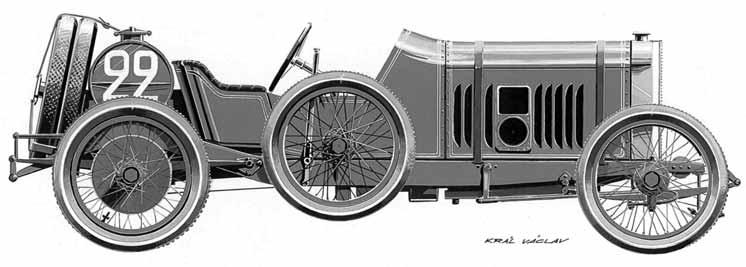 Obr. 2.14 Vůz Pipe řízený Jenatzym v roce 1907 na okruhu v Ardennách, s originální konstrukcí motorů z roku 1904 s rozvodem OHV se dvěma vačkovými hřídeli a s šikmými ventily