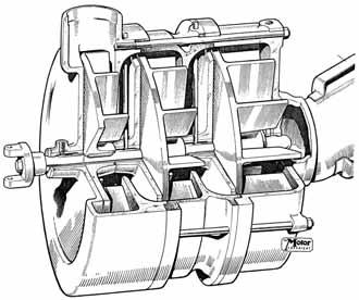 Podle své zásady vyzkoušet vše, co není už předem v rozporu s přírodními zákony, se o realizaci jako první pokusili Američané. Myšlénka to nebyla nová a pocházela z Evropy, kde si Gottlieb Daimler tento nápad patentoval už v roce 1885, patent na odstředivé dmychadlo dostal zase v roce 1902 Louis Renault. V letech 1907 a 1908 vybavil Američan Chadwick odstředivým dmychadlem konstrukce J. T. Nichollse (obr. 2.21) šest svých vozů pro závod do vrchu Great Dispair. Třístupňové dmychadlo se 12 lopatkami mělo průměr rotoru 10“ (254 mm) a bylo zprvu poháněno od setrvačníku o průměru 18“ (457 mm) plochým řemenem dvojnásobnými otáčkami než kliková hřídel motoru. Hnalo vzduch do velmi složitého přetlakového karburátoru. Později se už dmychadlo točilo devětkrát rychleji než motor a mělo 18 000 otáček za minutu, obvo-