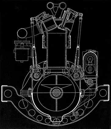 Motorová skříň se skládala ze dvou odlitků z hliníkové slitiny, válcový blok ze dvou litinových odlitků s hlavou slitou s válci (obr. 2.30). Kliková hřídel bez protizávaží měla tři ložiska, klika a ojnice byly uloženy na výstélkách z bílé kompozice na bázi cínu, setrvačník měl průměr 560 mm. Ventilový rozvod OHC s jednou vačkovou hřídelí ve středu hlavy byl poháněný svislou královskou hřídelí. Čtyři ventily v hlavě (dva sací a dva výfukové) byly v samostatných tělesech, umožňujících rychlou demontáž (obr. 2.31).