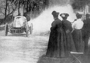 Obr. 1.7 Gabriel na voze Mors 1903 v závodě na původní trati Paříž-Madrid. Špatné zajištění tratě s diváky přímo u vozovky bylo příčinou mnoha tragedií