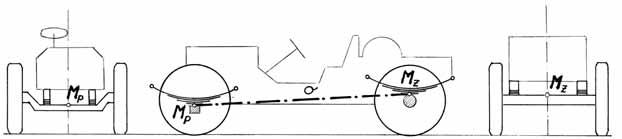 moment setrvačnosti. Volanty měly velký průměr, malým volantem nebylo možné vůz vůbec uřídit. I když na tuhé přední nápravě lze celkem dobře vyřešit korektní vzájemné natáčení obou kol, převod z volantu na nápravu se neobejde při pružení za jízdy bez chyb. Navíc u brzděné přední nápravy (obr. 2.61) zachytí pružiny i reakci brzdného momentu, zdeformují se a s následnou změnou úhlu záklonu rejdového čepu se změní i chování vozu. Tuhá hnací zadní náprava má kromě vysoké hmotnosti stálého převodu a diferenciálu další dvě negativní vlastnosti: v zatáčce se při náklonu odpružené hmoty listové svazky deformují opačně a na nápravě se projeví samořídící účinek (viz dodatek B, obr. 2.62), který se snaží vytočit nápravu na vnější stranu zatáčky a zvyšuje tak přetáčivost vozu. Přechod z řetězů na kloubovou hřídel přinesl další problém: při přenosu momentu z převodovky zachytí náprava reakci hnacího momentu a odlehčí až o 10 % pravé hnací kolo. U lehkých vozů se silnými motory, kde jde o mezní využití adheze, to bylo velmi nepříjemné jak v přímé jízdě, tak při výjezdu ze zatáčky. Ke konci dvacátých let byl tento problém natolik vážný, že Alfa Romeo použila u svého typu P3 komplikovanou konstrukci pohonu, aby tuto vlastnost eliminovala (viz kapitolu 4), ale konec problémů nastal až po přechodu na nezávislé odpružení zadní nápravy nebo při použití nápravy de Dion (viz dodatek B, obr. 2.63).