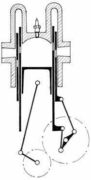 Aby se vůbec ventilům vyhnul, použil anglický Daimler v roce 1910 a po něm v Německu Mercedes a v Belgii Minerva pro cestovní vozy šoupátkový rozvod Knight (obr. 2.20). V roce 1913 ho převzal Mercedes pro vozy určené pro zámořské závody v USA, pro 500 mil v Indianapolis. Pokus se ale nesetkal s úspěchem. Mezi válcem a pístem byla dvě tenkostěnná válcová šoupátka, jejichž vzájemný pohyb otevíral a zavíral otvory do sacího a výfukového kanálu. Nastaly potíže jak s mazáním, tak zejména s chlazením, protože přestup tepla několika naolejovanými stěnami do vodního pláště byl špatný a hmoty s vratným pohybem byly příliš velké. Celý systém měl vysoké ztráty třením a rozvod spotřeboval 0,4 až 0,9 %