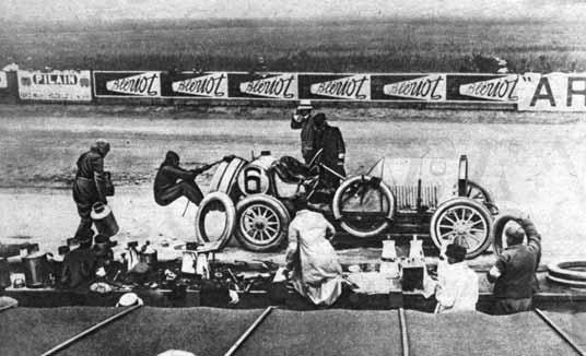Francie 1906 udělal Renault, Fiat, Brasier a Itala. Pak přišli Angličané se svým podílem na vývoji závodních vozů v podobě lehkých kol s drátěným výpletem (v roce 1908 Napier a po něm Hotchkiss) a v tomtéž roce se objevila první kola lisovaná z plechu. A v roce 1912 se už montovala na závodní vozy kvalitní a téměř bezkonkurenční drátěná kola anglické firmy Rudge-Whitworth. Výměna kola pak trvala už jen 40 vteřin. Zlepšily se i pneumatiky: zatímco Michelin v roce 1905 měnil pneumatiky už po pěti a půl minutách a vítěz GP z roku 1908 prováděl výměnu kol na 760km trati dvanáctkrát, změny kordu v období 1908 až 1912 dovolily v roce 1914 na téže trati výměnu pouze čtyřikrát. O umístění v závodě se už tehdy rozhodovalo i v depu: v roce 1908 si vystačil vítěz se sadou pneumatik 40 minut, ale čtvrtý v pořadí musel měnit obutí už po 20 minutách (obr. 2.24).