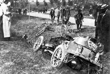 Obr. 1.6 Havarovaný vůz Marcela Renaulta v závodě Paříž-Madrid, Théry, květen 1903