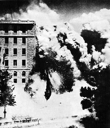 22. července 1946 – v prostředí zostřujícího se konfl iktu mezi palestinskými sionisty, palestinskými Araby a Brity dojde k bombovému útoku Irgunu na jihozápadní křídlo jeruzalémského hotelu King David, které toho času hostilo vedení britské administrativní správy v Palestině. Výbuch zabil více než 90 lidí, mezi nimi mnoho Židů. Ve své době šlo o jeden z největších teroristických útoků vůbec. Jeho cílem bylo také vyvolat pozornost světových médií, což se Irgunu podařilo.